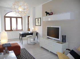 - Wohnzimmer mit Flachbild-TV (Satellit) und Schreibtisch
